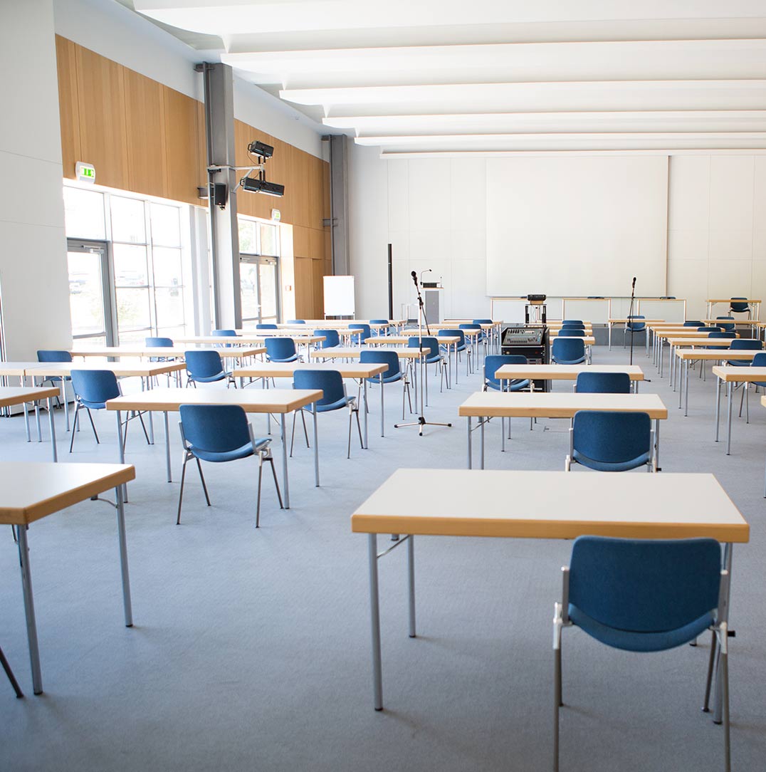 Der Konferenzsaal bietet bis zu 240 Gästen Platz und ist mit moderner Medientechnik bestückt. Durch eine mobile Trennwand lässt sich der Raum verkleinern und bei Bedarf teilen.